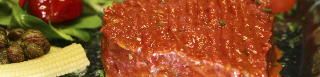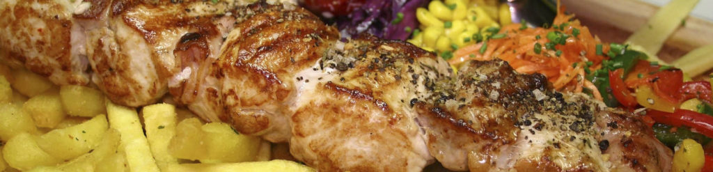 300g Spiess mit Schweinefleisch, Pommes frites und gemischtem Salat. Begleitet mit einer rassigen Kräuterbutter und einer pfiffigen BBQ-Sauce, serviert auf einem Holzbrett